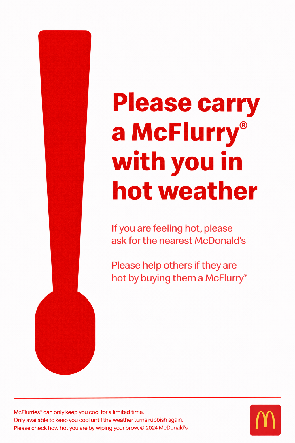 Inspired by the language of heatwave warnings and transport PSAs, our OOH campaign urges people to carry a McFlurry in hot weather not as a snack, but as an act of kindness. A playful reminder that sometimes, the coolest way to care for others… is with ice cream.