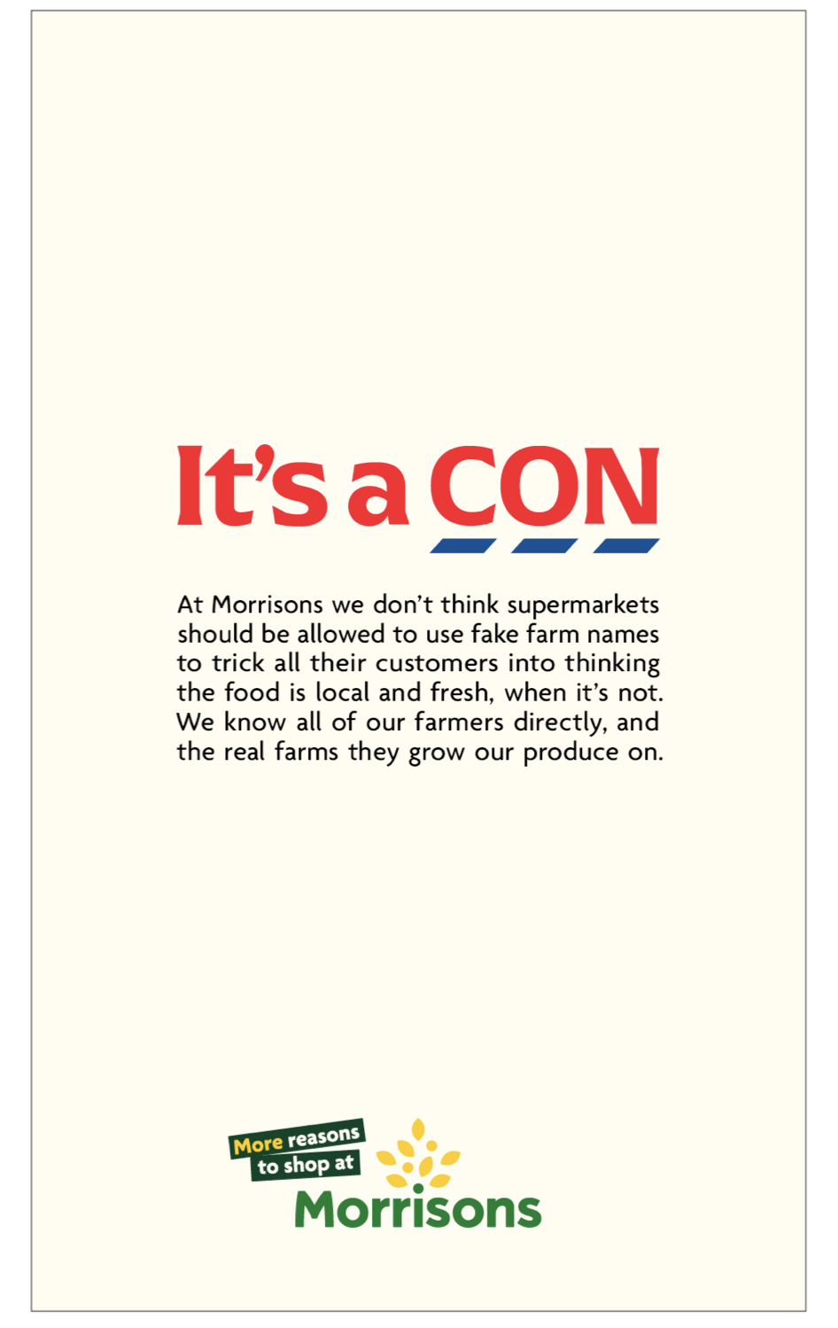 This print campaign called out competitors who mislead customers with fictional farm branding, reminding shoppers that Morrisons stands for honesty, traceability, and the real deal.